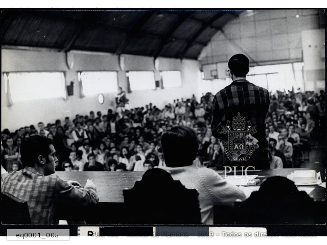 eq0001_005 | 26/6/1968 | Manifestação estudantil no antigo ginásio da PUC-Rio. Discussão sobre a participação da PUC-Rio na Passeata dos Cem Mil. |