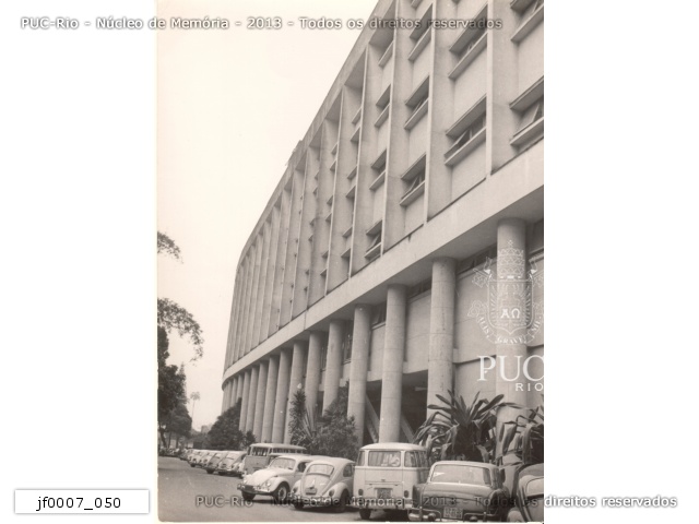 jf0007_050 | 1971 | Fachada do Edifício Cardeal Leme sem a extensão do prédio da Física, com fuscas, kombis e um Simka estacionados na frente. |