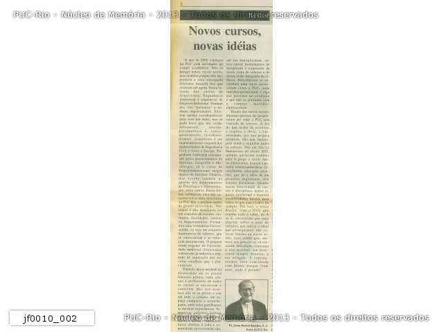 jf0010_002 | 2002 | Mensagem do Reitor publicada no Jornal da PUC, Ano XIV, nº 111, em abril de 2002, tratando dos cursos recém-inaugurados na PUC-Rio. |