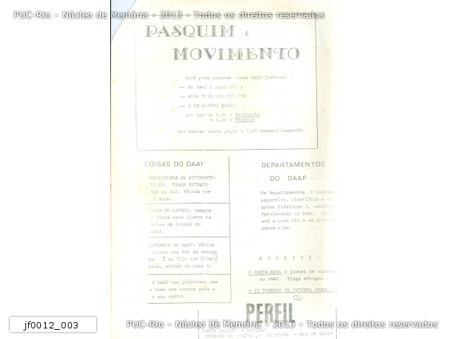 jf0012_003 | 1977 | página 03. Sem número. Informações sobre como adquirir os jornais (Informe daaf e Pasquim e Movimento), carteirinha de estudante, e de como vender e comprar livros. Coisas do daaf, departamentos do daaf. |