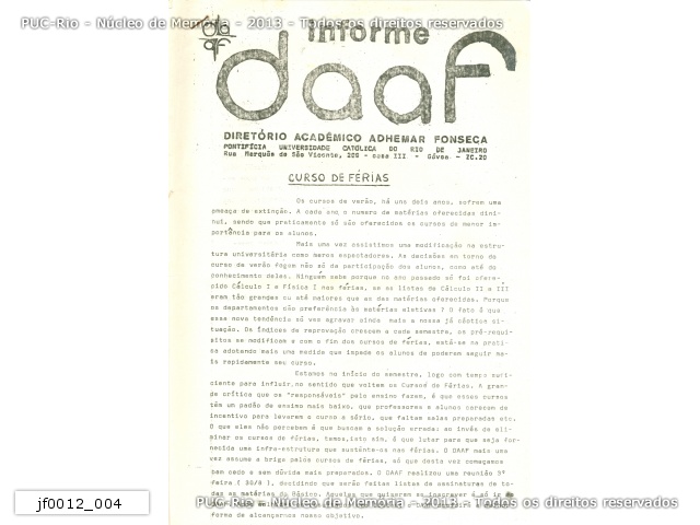 jf0012_004 | 8/1977 | página 01. Sem número. Publicado em agosto.Informe do Diretório Adhemar Fonseca sobre a realização de cursos de férias. |