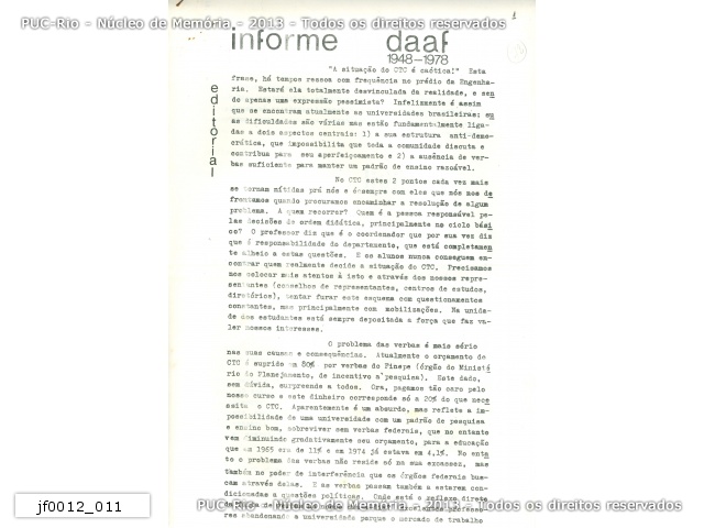 jf0012_011 | 1978 | Sem número. Sobre as dificuldades pelas quais as universidades brasileiras estavam passando. Ênfase na situação do CTC. |