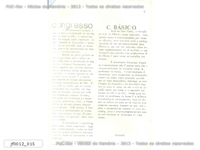 jf0012_015 | 1978 | Sem número. Aviso sobre um Congresso que estava sendo promovido pelo DCE. Lembrete para que os alunos do Ciclo Básico elegessem seus representantes. |