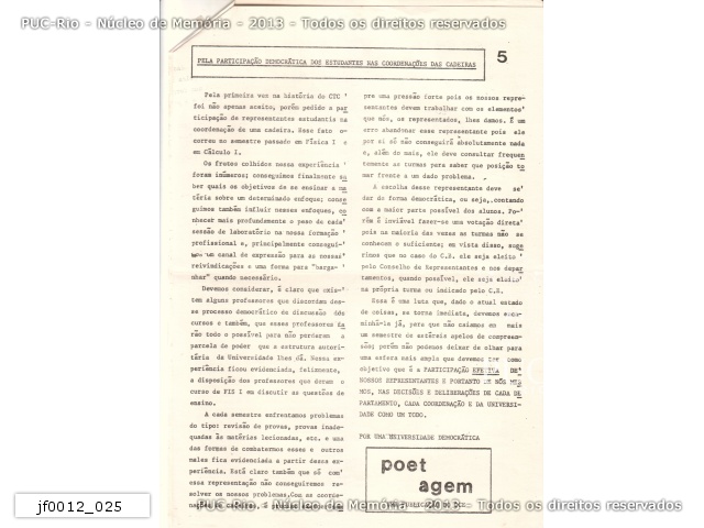 jf0012_025 | 1978 | página 05. Sem número. Informe do Diretório Adhemar Fonseca sobre a questão da participação dos estudantes na coordenação de cadeiras. Propaganda da publicação Poet Agem. |