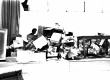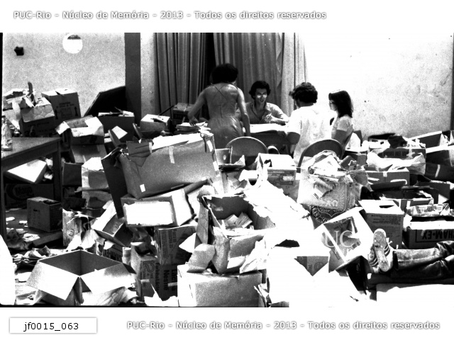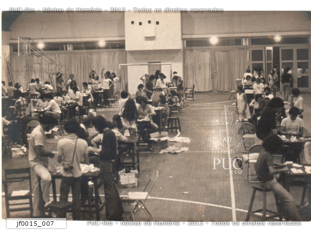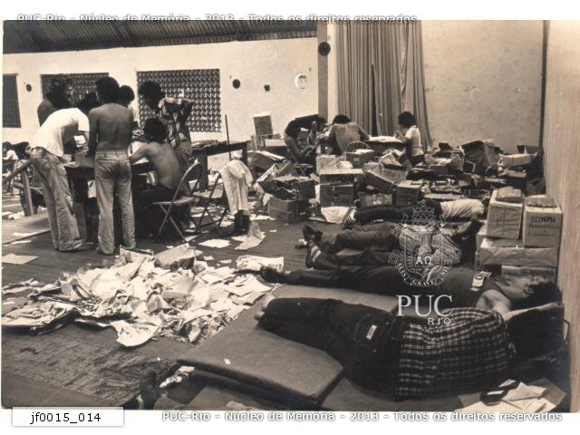 jf0015_014 | 5/10/1979 | Mesas de apuração dos votos. Alunos dormem em meio às caixas de papelão nos colchonetes do ginásio devido ao cansaço da virada de noite. |