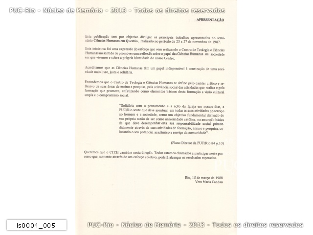 ls0004_005 | 15/3/1988 | Apresentação dos objetivos do Simpósio do CTCH com o tema Ciências Humanas em questão, realizado entre 25 e 27/11/1987. |