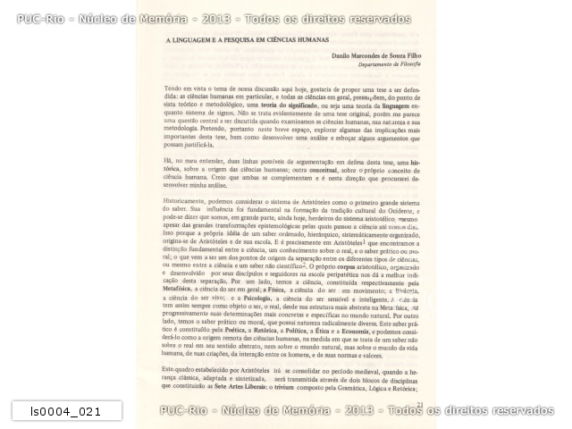 ls0004_021 | 11/1988 | Texto do prof. Danilo Marcondes de Souza Filho Departamento de Filosofia no simpósio de ciências humanas do CTCH. |