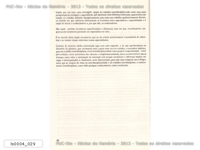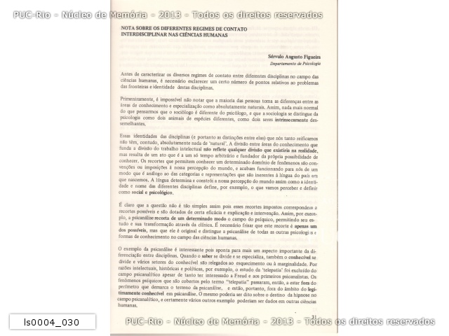 ls0004_030 | 11/1988 | Texto do professor Sérvulo Augusto Figueira do Departamento de Psicologia sobre a interdisciplinalidade das ciências humanas, tomando como exemplo a psicologia e a sociologia. |