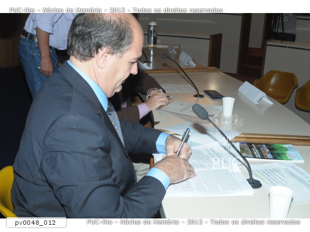 pv0048_011 | 3/10/2011 | A PUC-Rio foi designada para celebrar o Dia Mundial do Habitat de 2011 no Rio de Janeiro. O reitor Padre Josafá assina o compromisso da Universidade com a ONU HABITAT, representada pelo seu diretor na América Latina e Caribe, Alain Grimard. |