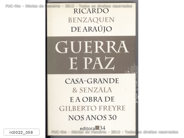 rc0022_058 | 1994 | Capa do livro Guerra e Paz: Casa-Grande e Senzala e a obra de Gilberto Freyre nos anos 30, do prof. Ricardo Benzaquen de Araújo. |