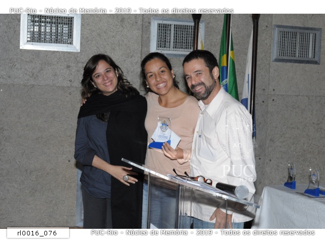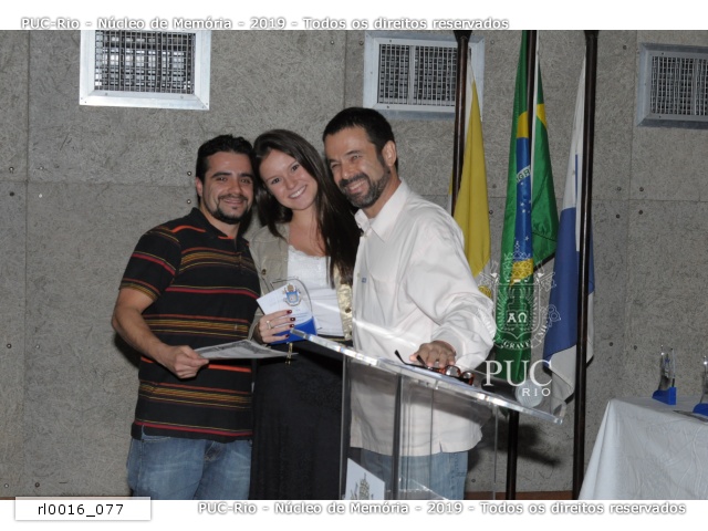 rl0016_076 | 31/8/2012 | Professor Sidnei Paciornik com bolsista premiada no XX Seminário de Iniciação Científica da PUC-Rio e sua coorientadora, profa. Alessandra de Sá. |