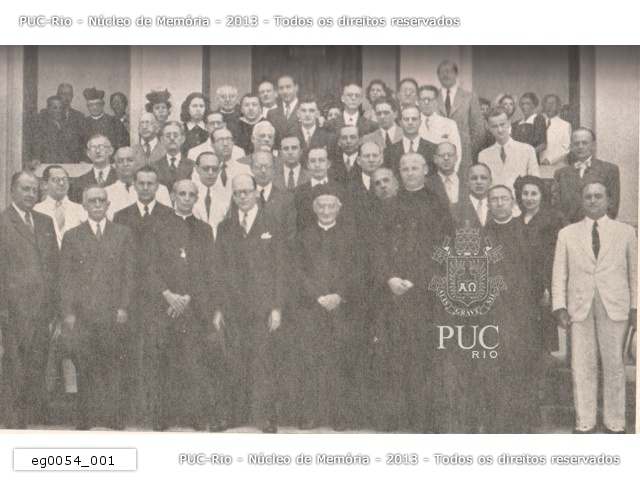 Fotografia tirada na Festa do Reitor. No centro vê-se o pe. Franca S.J, Gustavo Capanema, ministro da Educação e Saúde, e logo atrás deste o prof. Alceu Amoroso Lima. |