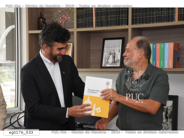 O prof. Marco Antonio recebe o Planejamento Estratégico da PUC-Rio de 2024-2030 do reitor pe. Anderson S.J. |