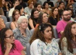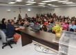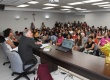 Mesa com palestrantes e ao fundo plateia presente no evento. |