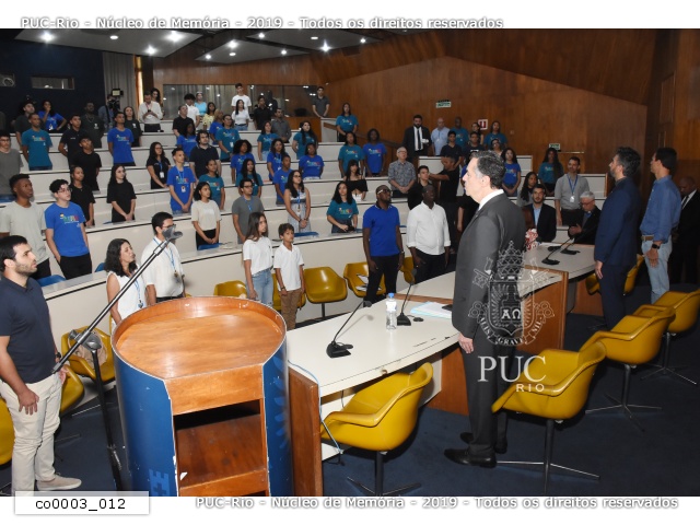 Palestrantes, equipe de mídia e plateia com alunos e professores durante o evento. |