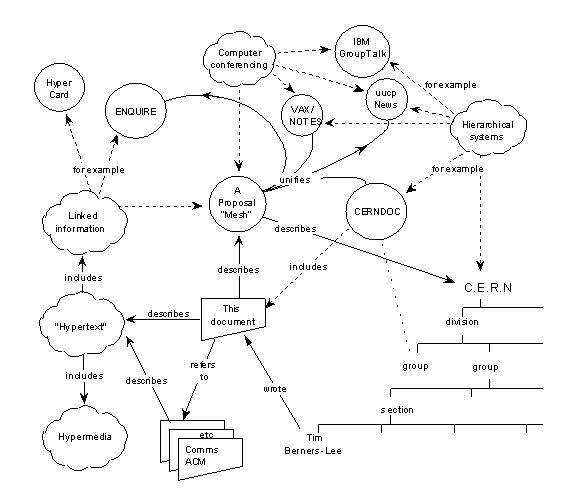 Ilustração utilizada no paper original de Tim Berners-Lee propondo a estrutura da World Wide Web > Início da World Wide Web. O pesquisador britânico Tim Berners-Lee desenvolve o conceito e as ferramentas básicas da World Wide Web.