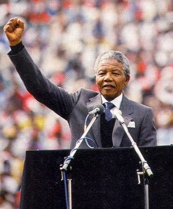 Nelson Mandela em seu discurso de posse da presidência. > Nelson Mandela assume a presidência da África do Sul. Nelson Mandela, líder da luta contra o appartheid que esteve 23 anos na prisão, é eleito presidente da África do Sul.