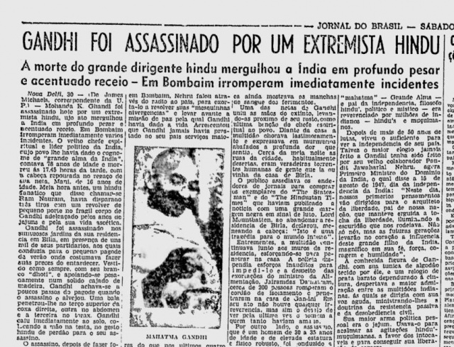 Notícia publicada no Jornal do Brasil sobre a morte de Gandhi.