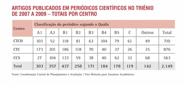 Artigos publicados em periódicos científicos no triênio de 2007 a 2009 – Totais por Centro - Classificação do periódico segundo o Qualis