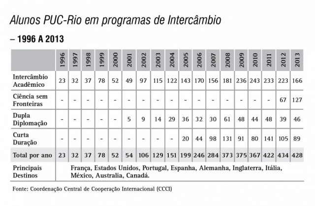 Alunos da PUC-Rio em programas de intercâmbio - série histórica