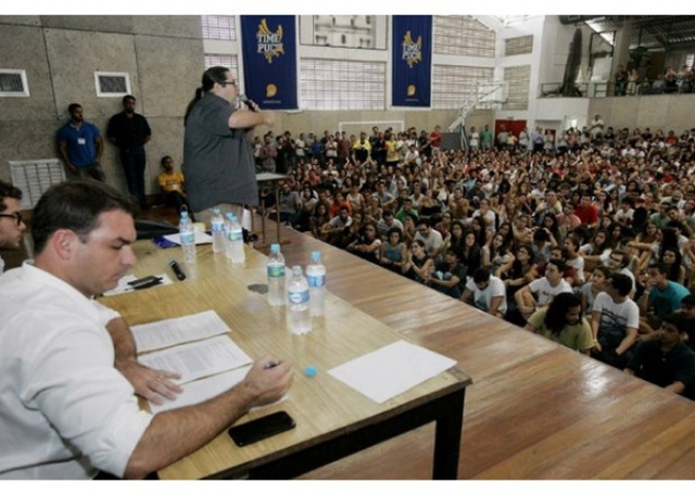 Com o deputado estadual Flávio Bolsonaro e o Prof. Tarcísio Motta, candidato a governador do Estado do Rio de Janeiro em 2014. Evento organizado pelo DCE Raul Amaro. Estiveram presentes mais de 1.700 pessoas, permitindo a arrecadação de cerca de uma tonelada de alimentos não perecíveis.