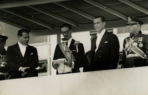 Jânio Quadros lê o discurso de posse entre Juscelino Kubitschek e João Goulart.