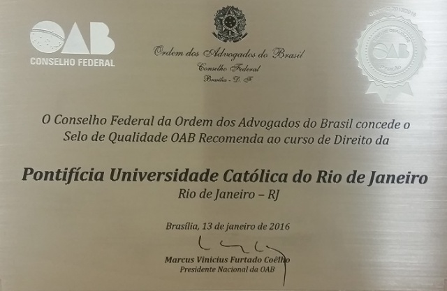 Em cerimônia realizada na sede nacional da Ordem dos Advogados do Brasil (OAB), com as presenças do presidente do STF, ministro Ricardo Lewandowski, e do ministro da Educação, Aloizio Mercadante, o curso de Direito da PUC-Rio foi um dos contemplados com o selo de qualidade OAB. O selo é entregue a cada três anos e leva em conta a aprovação de alunos no Exame de Ordem e o desempenho do curso no Enade. O selo OAB foi outorgado a apenas 11% dos cursos existentes no país.