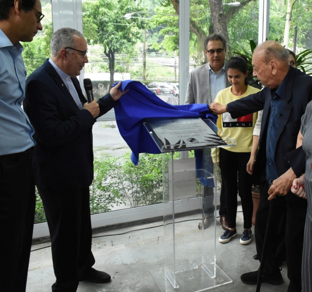 O Reitor Prof. Pe. Josafá Carlos de Siqueira S.J. e o homenageado, o ex-aluno Luiz Cyrillo Fernandes, participaram do descerramento da placa alusiva ao início da construção do Edifício Engenheiro Luiz Cyrillo Fernandes, que abrigará o Departamento de Biologia. O projeto arquitetônico foi desenvolvido pelo Departamento de Arquitetura e Urbanismo.