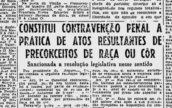 Notícia publicada no Jornal do Brasil sobre a aprovação da Lei Afonso Arinos. > Lei Afonso Arinos. A lei Afonso Arinos, sancionada em 3 de julho, proibe e penaliza a discriminação racial no Brasil.