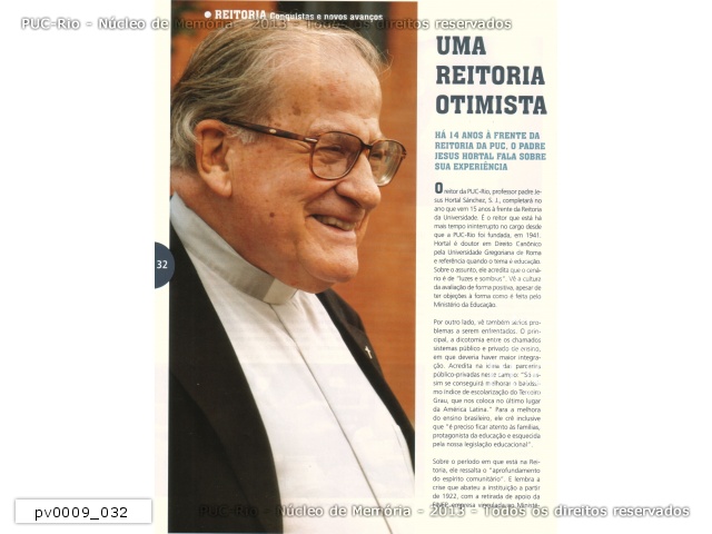 Matéria da Revista PONTES, n°1, com o Reitor prof. pe. Jesus Hortal Sánchez, S.J. 'Uma reitoria otimista'. (página 32) |