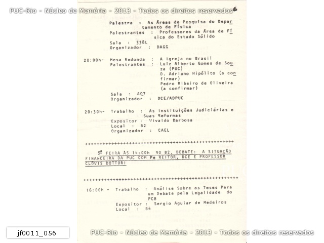 Programação do IV Congresso Interno da PUC-Rio. Página 6. Continuação das atividades do segundo dia do Congresso, 06/10/1981, incluindo mesas redondas, palestras e apresentação de trabalhos. DAAG, DCE, ADPUC, CAEL. |
