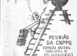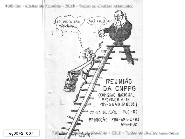 Charge de estudante subindo uma escada e pedindo ajuda ao Ministro do Planejamento Delfim Neto, em panfleto da APG-PUC e da APG-UFRJ, que convoca para reunião da CNPPG (Comissão Nacional Provisória de Pós-Graduandos), 22 e 23 de abril (de 1983), na PUC-Rio. |