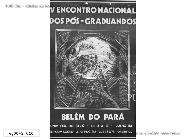 Cartaz de divulgação do V Encontro Nacional dos Pós-graduandos, em Belém/PA, 06 a 13/07/1983. Desenho de uma pessoa saindo de um poço, do ponto de vista dessa pessoa. |