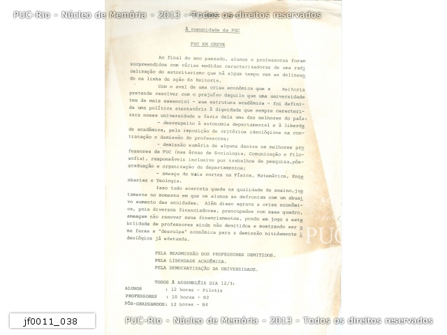 Análise das causas da greve dos estudantes e professores da PUC-Rio. Pela readmissão dos professores demitidos e autonomia departamental. |