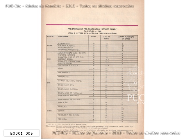 ls0001_005 | 1988 | Lista de cursos de pós-graduação da PUC-Rio em 1988, listados por centro, com o ano de início e a última avaliação da CAPES até então. |
