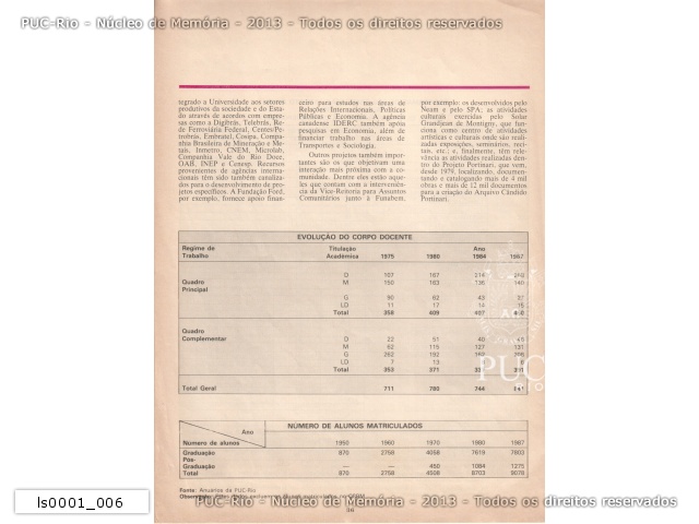 ls0001_006 | 1988 | Quadro de evolução do corpo docente de 1975 até 1987 e o número de alunos matrículados de 1950 até 1987, exceto os alunos do CCBM. |