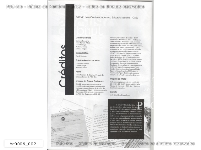 hc0006_002 | 11/2010 | Créditos da edição de Novembro de 2010, ano XV do jornal 'O Pilotís Jurídico'. O jornal é um orgão de informação e opinião dos alunos de direito da PUC-Rio. |
