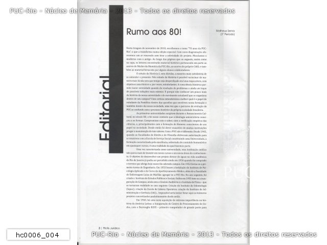 hc0006_005 | 11/2010 | Segunda página do Editorial da edição de Novembro de 2010, ano XV do jornal 'O Pilotís Jurídico'. O editorial desta edição fala sobre os 70 anos da PUC-Rio e descreve uma pouco de sua trajetória. |