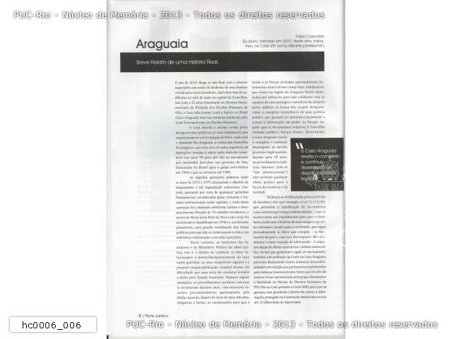 hc0006_006 | 11/2010 | Artigo da edição de Novembro de 2010, ano XV do jornal 'O Pilotís Jurídico'. O artigo fala do caso Araguaia que aborda o drama vivivo pelos desaperecidos políticos e seus familiares que organizaram a Guerrilha do Araguaia. |