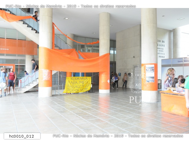 hc0010_012 | 22/11/2011 | Faixa amarela com campanha de chapa concorrente ao DCE, Roda-Viva, "Meia passagem para todos". Nos pilotis cartazes colados de uma chapa concorrente ao CAEL |