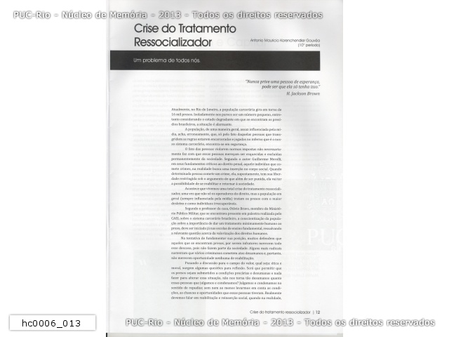 Artigo sobre os sistemas carcerários no Rio de Janeiro que questiona se a forma como se dá tal sistema é a mais indicada. Edição de Novembro de 2010, ano XV do jornal 'O Pilotís Jurídico'. |