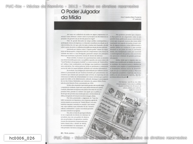 Artigo sobre como se dá o papel da midia em divulgar casos criminais e o tom condenatório e sensacionalista dado pela mesma, violando o princípio da imparcialidade. Edição de Novembro de 2010, ano XV do jornal 'O Pilotís Jurídico'. |
