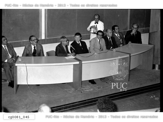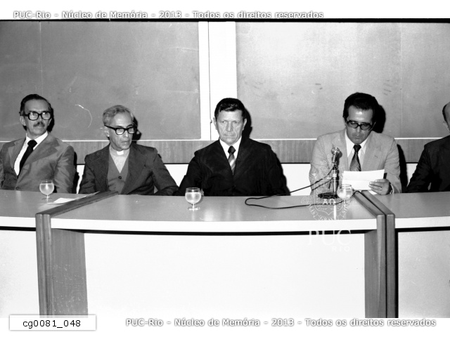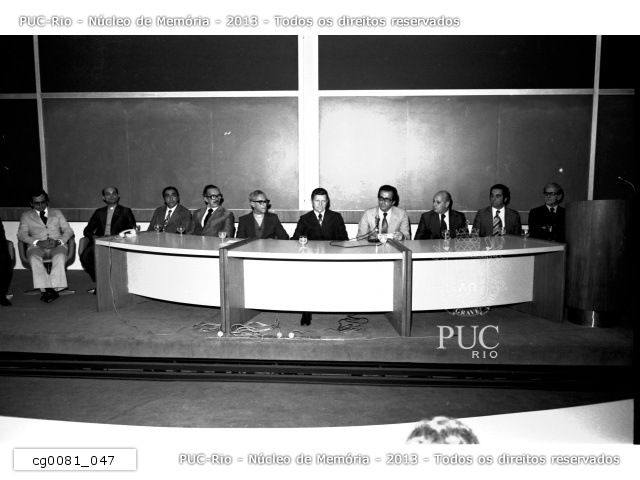 Cerimônia com o Ministro das Comunicações Euclides Quandt de Oliveira com padres e professores da PUC-Rio após visitarem as instalações do CETUC. |
