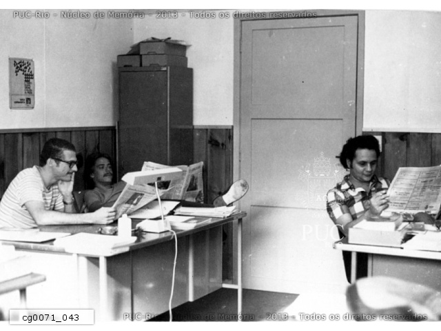 Grupo de pessoas numa sala do CETUC. Algumas lêem jornal, inclusive uma edição do Pasquim. |