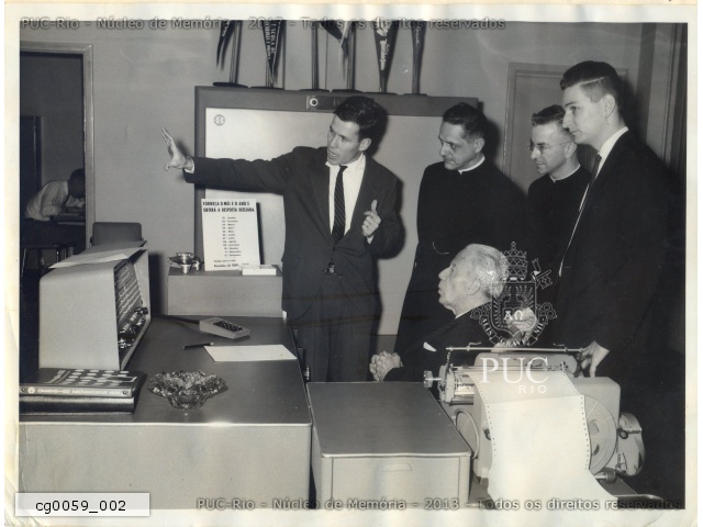 O presidente da República, Juscelino Kubitschek, inaugura o computador eletrônico Burroughs 205, primeiro computador da PUC-Rio, por ocasião da visita do cardeal Montini, futuro Papa Paulo VI. |