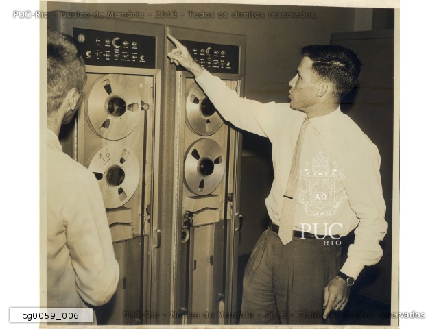 Georg Herz, engenheiro da Burroughs, demonstra as operações do computador Burroughs 205, o primeiro computador da PUC-Rio, conhecido como cérebro eletrônico e com memória de cerca de 16Kb. |