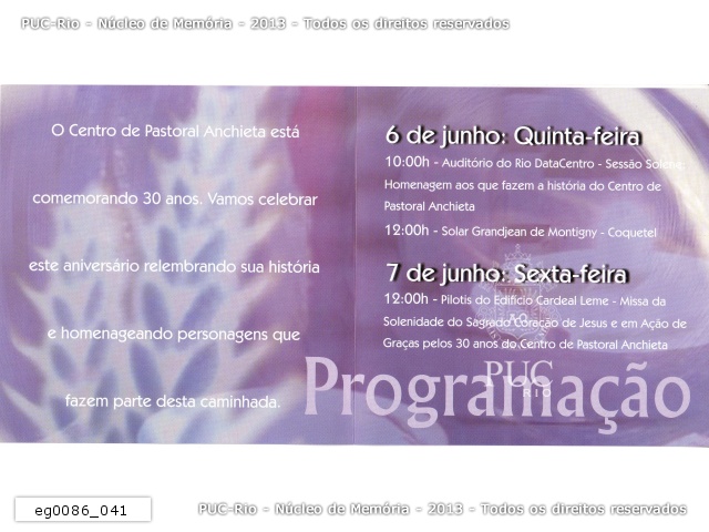 eg0086_040 | 2002 | Convite com a programação dos 30 anos da Pastoral realizado nos dia 06 e 07 de junho. |