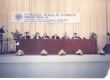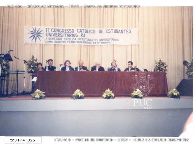 Mesa de abertura do II Congresso Católico de Estudantes Universitários - CCEU. Faixa com o texto "A identidade católica dos estudantes universitários como agentes transformadores do 3o. milênio". |