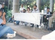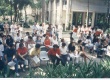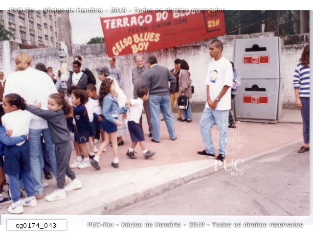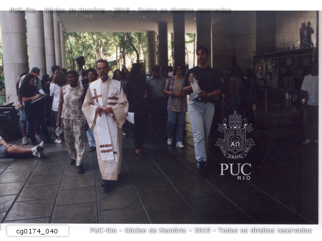 Visita da imagem de Nossa Senhora de Aparecida, que estava percorrendo as paróquias do Rio de Janeiro em preparação ao II Encontro Mundial do Papa com as Famílias. Ela ficaria aquele dia inteiro na capela da PUC-Rio. Na foto, ao fundo, faixa com anúncio de show de Celso Blues Boy no terraço do Rio Sul organizado pelo DCE, CAAD, CACOS e CAEL. |