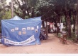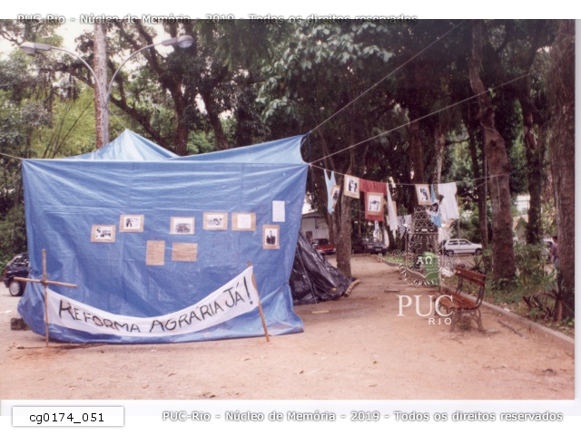 II FEVUC - Feira de Valores da Universidade Católica. Tenda de lona e plásticos montada no estacionamento interno, com cartazes e faixa sobre reforma agrária. |